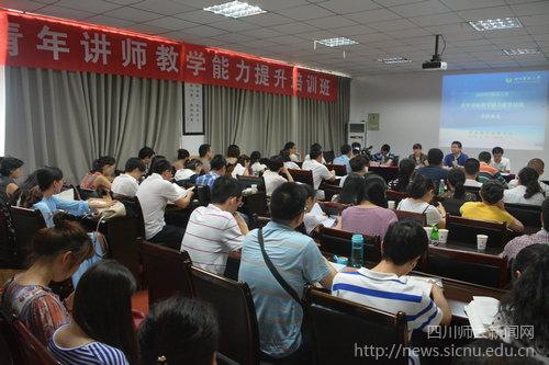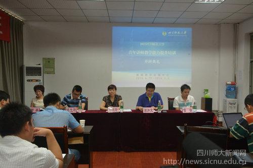 2015年6月29日上午,由教师教学发展中心主办的四川师范大学2015年青年讲师教学能力提升培训在狮子山校区四教701室开班。四川师范大学副校长祁晓玲,人事处副处长屈加文,教务处副处长任立刚,教师教学发展中心主任郭英、副主任雷云,以及各教学单位推荐的四十余名参训教师参加了开班仪式。开班仪式由郭英主持。